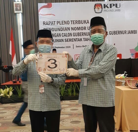Dari live KPU Provinsi Jambi melalui channel Youtube, menggunakan kemeja biru bermotiv kotak-kotak, pasangan jargon Jambi Mantap ini mendapatkan nomor urut 3.