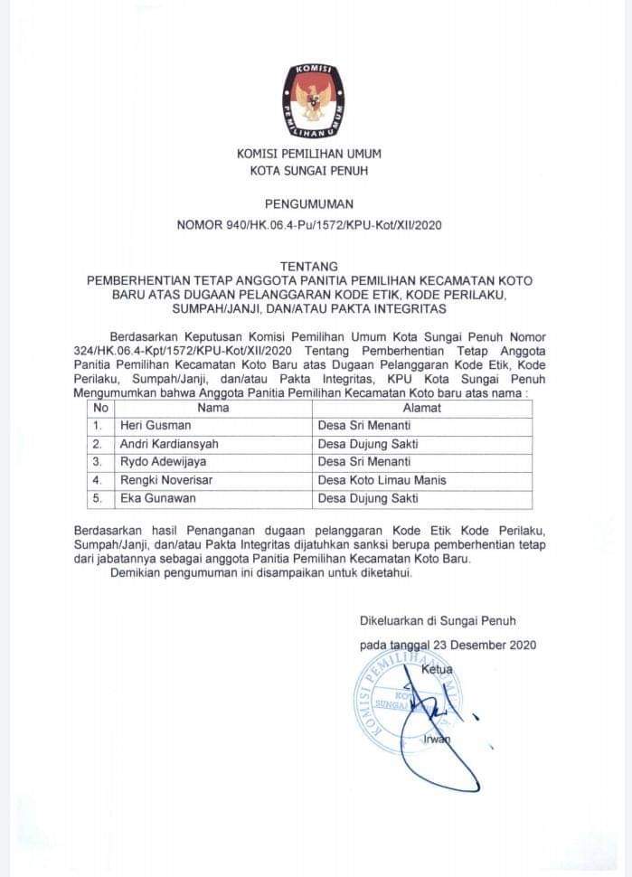 “Lima anggota PPK Koto Baru yang diberhentikan yakni, Heri Gusman (Desa Sri Menanti). Andri Kardiansyah (Desa Dujung Sakti), Rydo Adewijaya (Desa Sri Menanti). Rengki Noviresar (Desa Koto Limau Manis) dan Eka Gunawan (Desa Dujung Sakti),” bunyi pemberitahuan KPU Kota Sungai Penuh.
