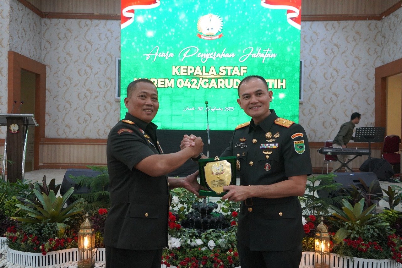 Jambi, Koranjambi.com – Komando Resor Militer (Korem) 042/Gapu menggelar acara penyerahan tugas jabatan Kepala Staf Korem (Kasrem) 042/Gapu, Selasa (30/9/2025), yang dipimpin langsung oleh Danrem 042/Gapu Brigjen TNI Heri Purwanto, S.E., M.Sc. Penyerahan jabatan tersebut dilakukan sehubungan dengan berakhirnya masa tugas Brigjen TNI Slamet Riadi, S.I.P., yang selama ini menjabat sebagai Kasrem 042/Gapu.
