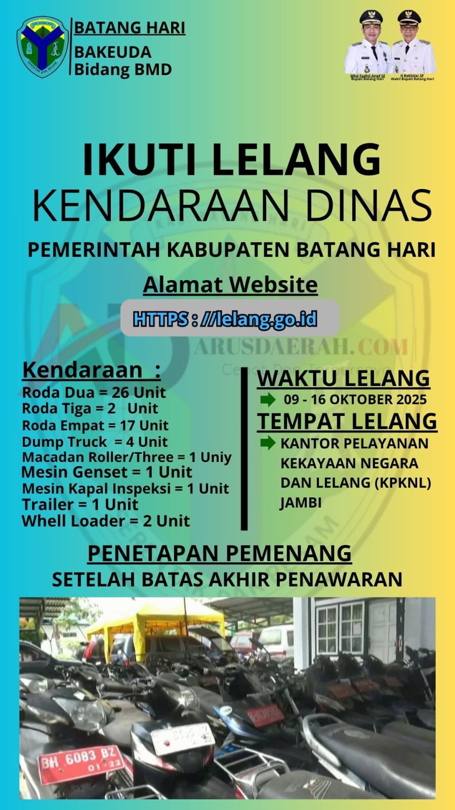 Pemerintah Kabupaten Batang Hari mengimbau kepada seluruh masyarakat untuk ikut berpartisipasi dalam proses lelang ini secara tertib dan sesuai ketentuan yang berlaku serta menjadikan kesempatan ini sebagai sarana memperoleh kendaraan dengan harga kompetitif dan proses yang transparan.